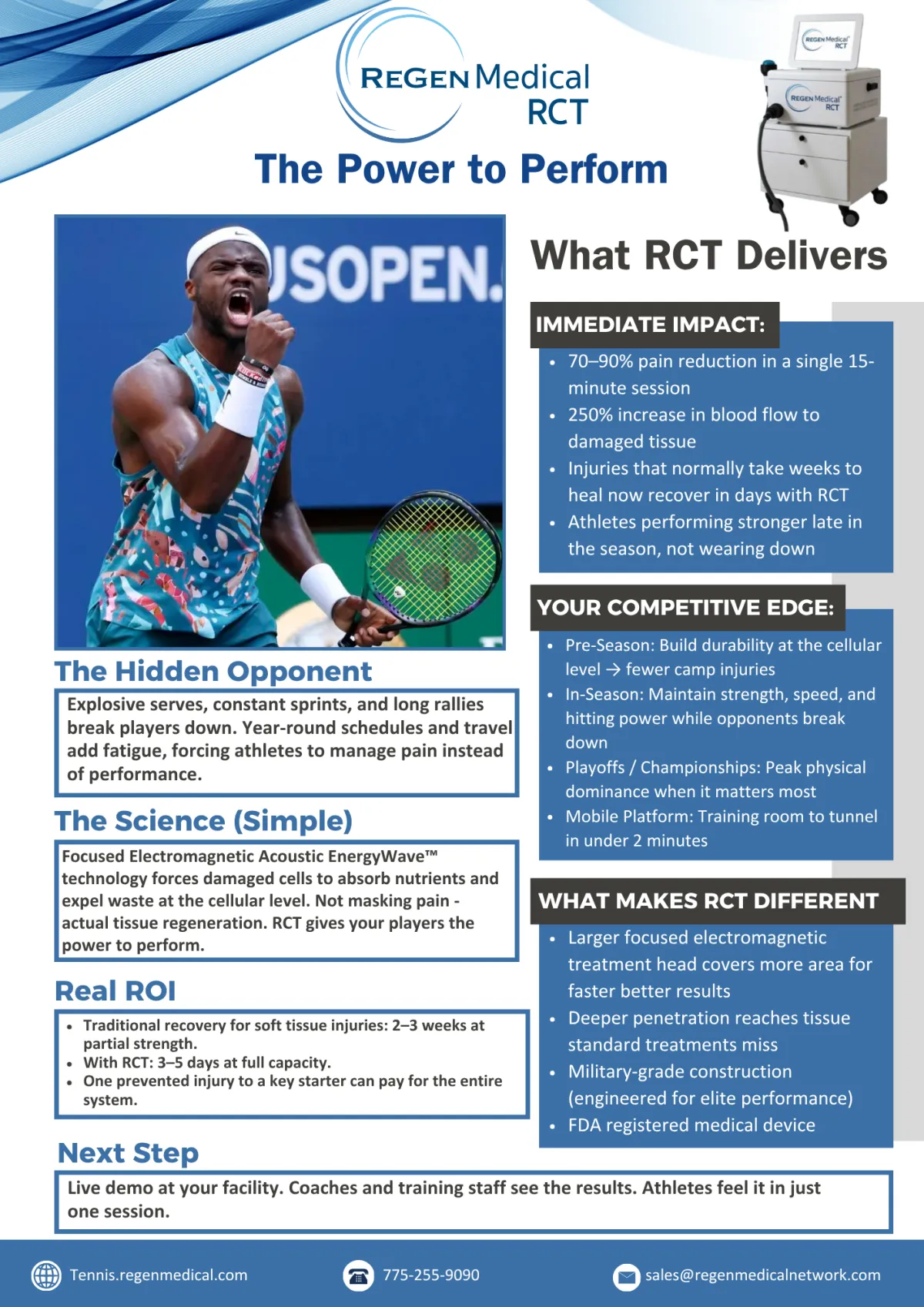 Elite tennis players and programs are turning to Regenerative Cellular Technology (RCT) for one reason: it keeps players at peak performance through grueling tournaments and demanding schedules – accelerating recovery, fortifying tissue resilience, and minimizing downtime. It's a cutting-edge, non-invasive therapy that uses Focused Electromagnetic Acoustic EnergyWave™ to supercharge the body's own healing so your players dominate every match on the court and recover faster between tournaments.